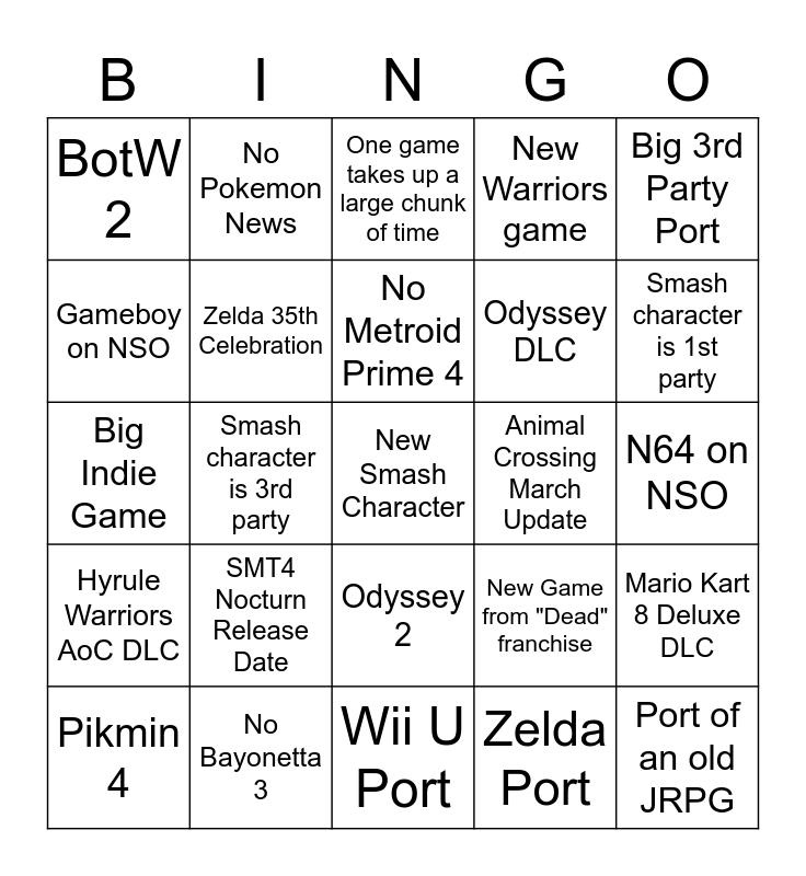 This bingo card has a free space and 24 words: SMT4 Nocturn Release Date, No Bayonetta 3, No Metroid Prime 4, Pikmin 4, Big 3rd Party Port, BotW 2, Gameboy on NSO, No Pokemon News, Animal Crossing March Update, Odyssey 2, Odyssey DLC, Big Indie Game, New Game from "Dead" franchise, Mario Kart 8 Deluxe DLC, Zelda 35th Celebration, Zelda Port, N64 on NSO, One game takes up a large chunk of time, Smash character is 1st party, Smash character is 3rd party, Port of an old JRPG, Hyrule Warriors AoC DLC, New Warriors game and Wii U Port.