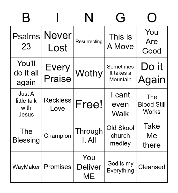 This bingo card has a free space and 24 words: Champion, Promises, Wothy, WayMaker, You Are Good, Psalms 23, You'll do it all again, Never Lost, I cant even Walk, Through It All, Sometimes It takes a Mountain, Just A little talk with Jesus, Old Skool church medley, Take Me there, Every Praise, God is my Everything, The Blood Still Works, Resurrecting, Do it Again, Reckless Love, Cleansed, The Blessing, This is A Move and You Deliver ME.