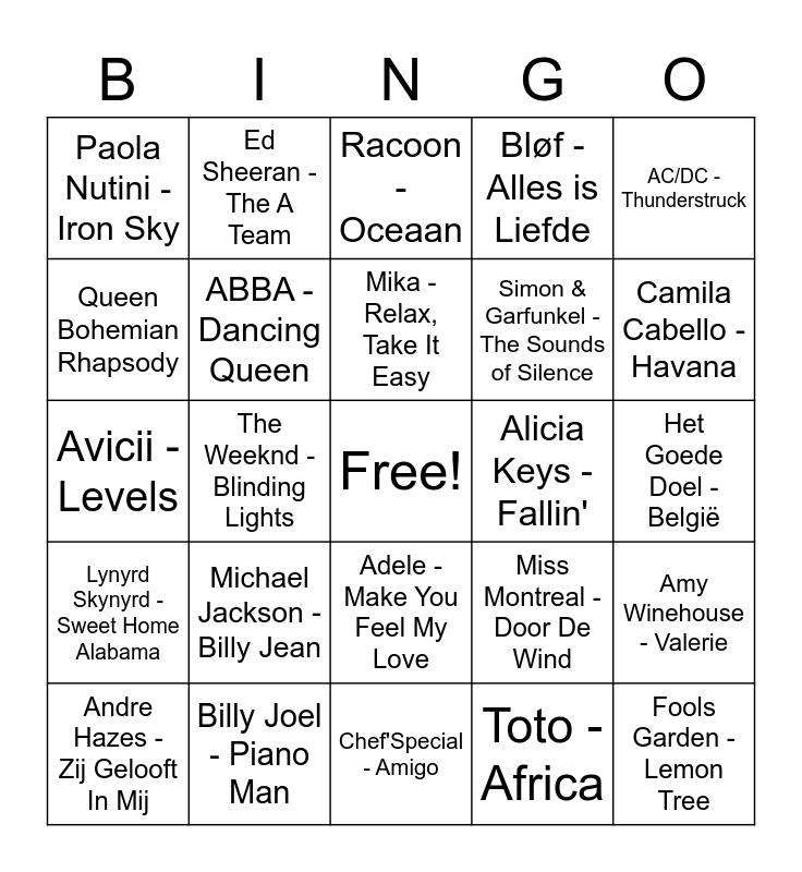 This bingo card has a free space and 39 words: Nena - 99 Luftballons, Gloria Estefan - Conga, Coldplay - Yellow, ABBA - Dancing Queen, Andre Hazes - Zij Gelooft In Mij, Adele - Make You Feel My Love, Mika - Relax, Take It Easy, K3 - Oya LéLé, AC/DC - Thunderstruck, Lynyrd Skynyrd - Sweet Home Alabama, The Weeknd - Blinding Lights, Bløf - Alles is Liefde, Fools Garden - Lemon Tree, Het Goede Doel - België, Alicia Keys - Fallin', Michael Jackson - Billy Jean, Aretha Franklin - Respect, Paola Nutini - Iron Sky, Prince - Purple Rain, Miss Montreal - Door De Wind, Queen Bohemian Rhapsody, Chef'Special - Amigo, Simon & Garfunkel - The Sounds of Silence, Camila Cabello - Havana, Deep Purple - Smoke on the Water, The Weather Girls - It's Raining Men, Red Hot Chili Peppers - Californication, Krezip - I Would Stay, Paul Simon - Late in the Evening, Ed Sheeran - The A Team, The Pointer Sisters - Jump, Michael Sembello - Maniac, Racoon - Oceaan, Billy Joel - Piano Man, Toto - Africa, Metallica - Nothing Else Matters, Amy Winehouse - Valerie, Avicii - Levels and Suzan & Freek, Snelle - De Overkant.