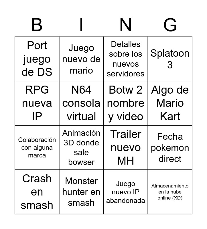 This bingo card has 16 words: Monster hunter en smash, Fecha pokemon direct, Detalles sobre los nuevos servidores, Port juego de DS, Colaboración con alguna marca, Juego nuevo de mario, Trailer nuevo MH, Juego nuevo IP abandonada, RPG nueva IP, N64 consola virtual, Crash en smash, Splatoon 3, Animación 3D donde sale bowser, Algo de Mario Kart, Botw 2 nombre y video and Almacenamiento en la nube online (XD).