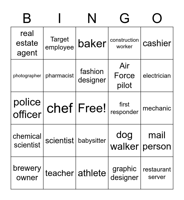 This bingo card has a free space and 34 words: artist, graphic designer, toy maker, farmer, chemical scientist, pharmacist, cashier, brewery owner, Target employee, doctor, fashion designer, baker, librarian, author, first responder, electrician, teacher, police officer, scientist, dog walker, babysitter, dentist, real estate agent, mechanic, athlete, restaurant server, construction worker, model, Air Force pilot, photographer, plumber, chef, mail person and actor.