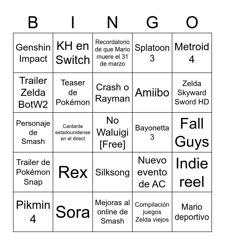 This bingo card has a free space and 24 words: Rex, Sora, Crash o Rayman, Pikmin 4, Metroid 4, Genshin Impact, Trailer Zelda BotW2, KH en Switch, Bayonetta 3, Silksong, Amiibo, Personaje de Smash, Nuevo evento de AC, Indie reel, Teaser de Pokémon, Compilación juegos Zelda viejos, Fall Guys, Recordatorio de que Mario muere el 31 de marzo, Zelda Skyward Sword HD, Cantante estadounidense en el direct, Mario deportivo, Trailer de Pokémon Snap, Splatoon 3 and Mejoras al online de Smash.