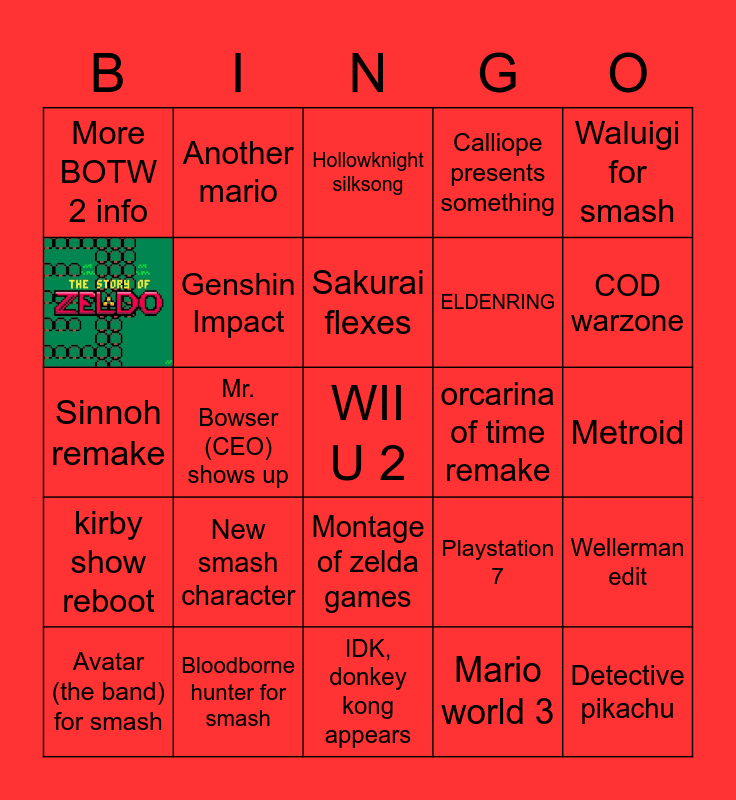 This bingo card has 1 images, a free space and 23 words: New smash character, Bloodborne hunter for smash, Sakurai flexes, Avatar (the band) for smash, Waluigi for smash, More BOTW 2 info, Another mario, orcarina of time remake, Montage of zelda games, ELDENRING, Sinnoh remake, Playstation 7, Wellerman edit, Genshin Impact, Mario world 3, Metroid, Hollowknight silksong, COD warzone, Mr. Bowser (CEO) shows up, Detective pikachu, kirby show reboot, Calliope presents something and IDK, donkey kong appears.