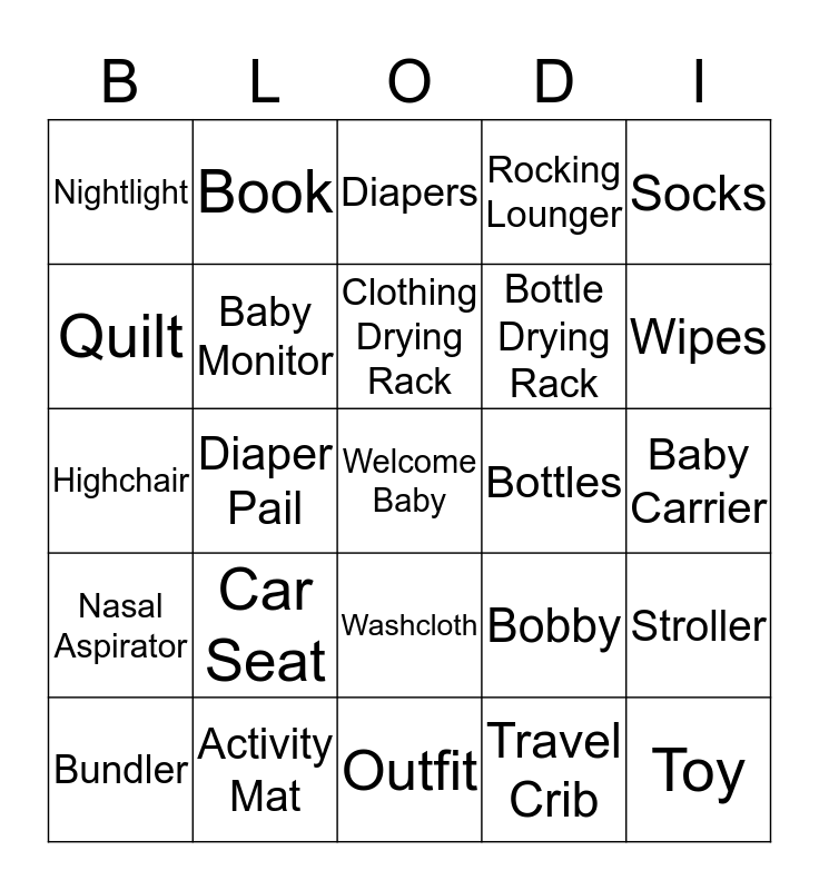 This bingo card has a free space and 24 words: Car Seat, Activity Mat, Clothing Drying Rack, Bundler, Socks, Nightlight, Quilt, Book, Bottles, Washcloth, Bottle Drying Rack, Highchair, Bobby, Stroller, Baby Monitor, Travel Crib, Baby Carrier, Diapers, Wipes, Diaper Pail, Toy, Nasal Aspirator, Rocking Lounger and Outfit.