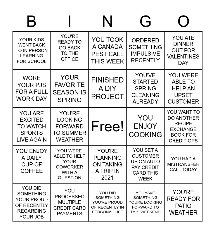 This bingo card has a free space and 24 words: YOU WERE ABLE TO HELP YOUR COWORKER WITH A QUESTION, YOU PROCESSED MULTIPLE CREDIT CARD PAYMENTS, FINISHED A DIY PROJECT, YOU DID SOMETHING YOUR PROUD OF RECENTLY REGARDING YOUR JOB, YOU ATE DINNER OUT FOR VALENTINES DAY, YOUR KIDS WENT BACK TO IN PERSON LEARNING FOR SCHOOL, WORE YOUR PJS FOR A FULL WORK DAY, YOU'RE READY TO GO BACK TO THE OFFICE, YOU ENJOY COOKING, YOU'RE PLANNING ON TAKING A TRIP IN 2021, YOU'VE STARTED SPRING CLEANING ALREADY, YOU ARE EXCITED TO WATCH SPORTS LIVE AGAIN, YOU SET A CUSTOMER UP ON AUTO PAY CREDIT CARD THIS WEEK, YOU HAD A MISTRANSFER CALL TODAY, YOUR FAVORITE SEASON IS SPRING, YOUHAVE SOMETHING YOURE LOOKING FORWARD TO THIS WEEKEND, YOU WANT TO DO ANOTHER RECIPE EXCHANGE BOOK FOR CREDIT OPS, YOU TOOK A CANADA PEST CALL THIS WEEK, YOU WERE ABLE TO HELP AN UPSET CUSTOMER, YOU'RE LOOKING FORWARD TO SUMMER WEATHER, YOU'RE READY FOR PATIO WEATHER, YOU ENJOY A DAILY CUP OF COFFEE, ORDERED SOMETHING IMPULSIVE RECENTLY and YOU DID SOMETHING YOU'RE PROUD OF RECENTLY IN PERSONAL LIFE.