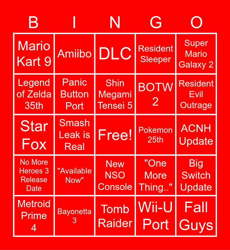This bingo card has a free space and 24 words: "Available Now", Bayonetta 3, Shin Megami Tensei 5, Metroid Prime 4, Super Mario Galaxy 2, Mario Kart 9, Legend of Zelda 35th, Amiibo, Pokemon 25th, New NSO Console, BOTW 2, Star Fox, "One More Thing..", Big Switch Update, Panic Button Port, Wii-U Port, ACNH Update, DLC, Resident Evil Outrage, Smash Leak is Real, Fall Guys, No More Heroes 3 Release Date, Resident Sleeper and Tomb Raider.
