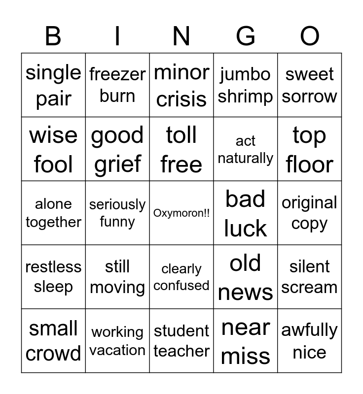 This bingo card has a free space and 27 words: old news, never again, act naturally, student teacher, wise fool, minor crisis, freezer burn, restless sleep, bad luck, silent scream, alone together, jumbo shrimp, small crowd, working vacation, top floor, love hate, good grief, toll free, still moving, single pair, original copy, near miss, seriously funny, awfully nice, clearly confused, sweet sorrow and crash landing.