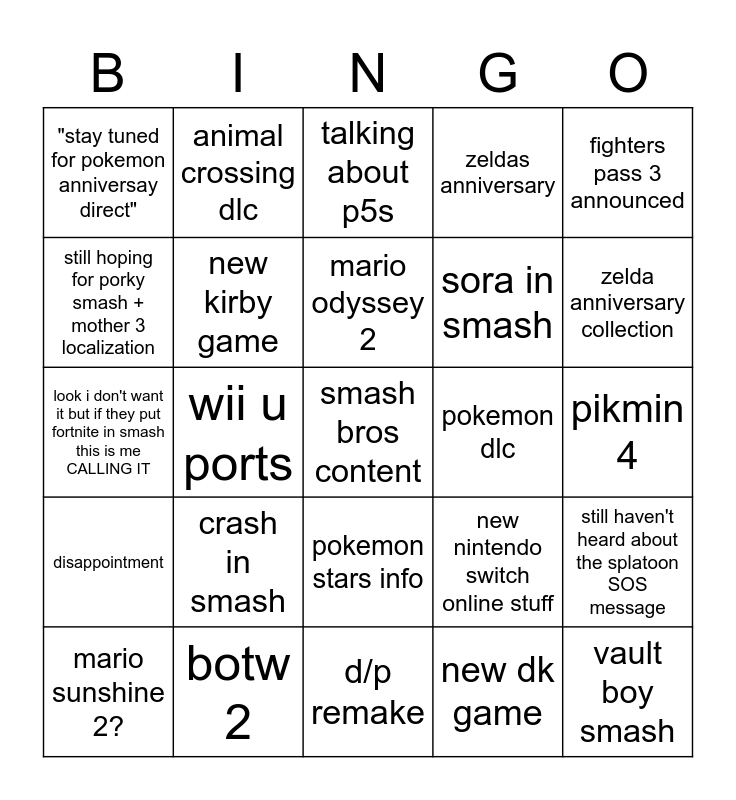 This bingo card has a free space and 24 words: crash in smash, botw 2, mario odyssey 2, mario sunshine 2?, fighters pass 3 announced, "stay tuned for pokemon anniversay direct", still hoping for porky smash + mother 3 localization, animal crossing dlc, pokemon dlc, pokemon stars info, sora in smash, look i don't want it but if they put fortnite in smash this is me CALLING IT, new nintendo switch online stuff, still haven't heard about the splatoon SOS message, new kirby game, new dk game, pikmin 4, talking about p5s, zelda anniversary collection, wii u ports, vault boy smash, disappointment, zeldas anniversary and d/p remake.