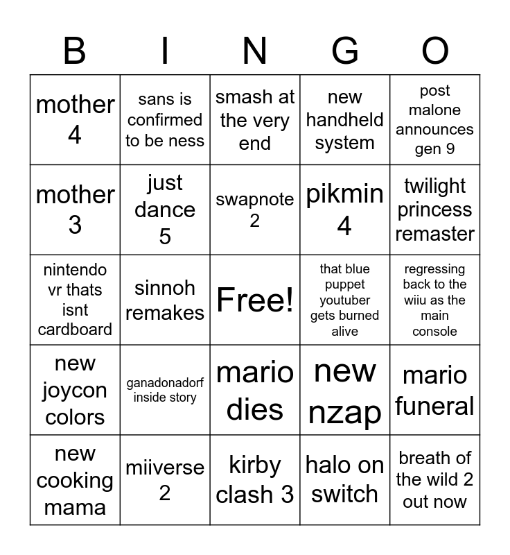 This bingo card has a free space and 24 words: ganadonadorf inside story, miiverse 2, swapnote 2, new cooking mama, post malone announces gen 9, mother 4, mother 3, sans is confirmed to be ness, that blue puppet youtuber gets burned alive, mario dies, pikmin 4, nintendo vr thats isnt cardboard, new nzap, mario funeral, just dance 5, halo on switch, regressing back to the wiiu as the main console, smash at the very end, twilight princess remaster, sinnoh remakes, breath of the wild 2 out now, new joycon colors, new handheld system and kirby clash 3.