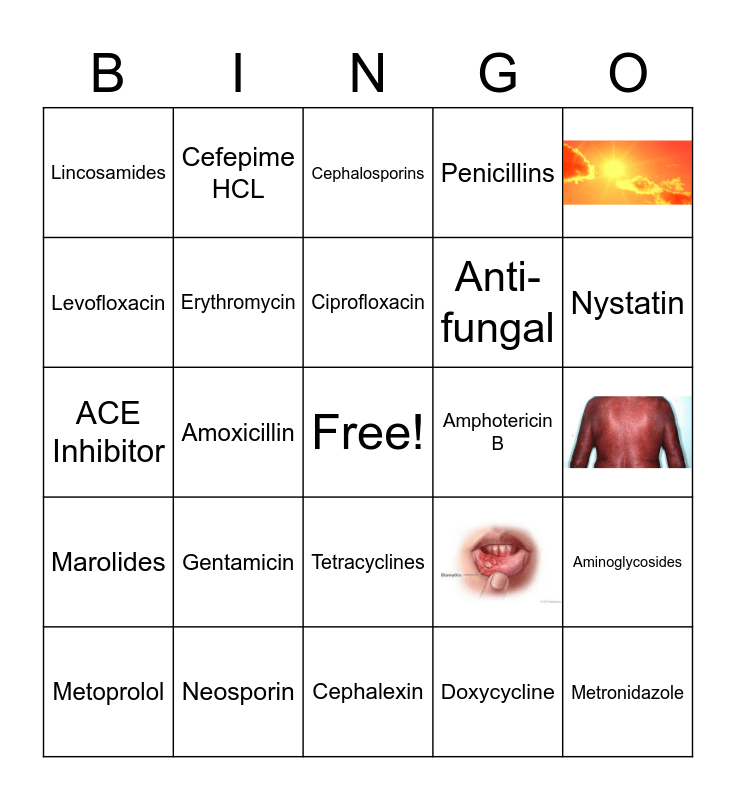 This bingo card has 4 images, a free space and 24 words: Aminoglycosides, Sulfonamides, Anti-fungal, Doxycycline, Levofloxacin, Cephalosporins, Cefepime HCL, Marolides, Amphotericin B, Metoprolol, ACE Inhibitor, Penicillins, Neosporin, Cephalexin, Nystatin, Fluroquinolones, Gentamicin, Erythromycin, Ciprofloxacin, Tetracyclines, Lincosamides, Vancomycin, Metronidazole and Amoxicillin.