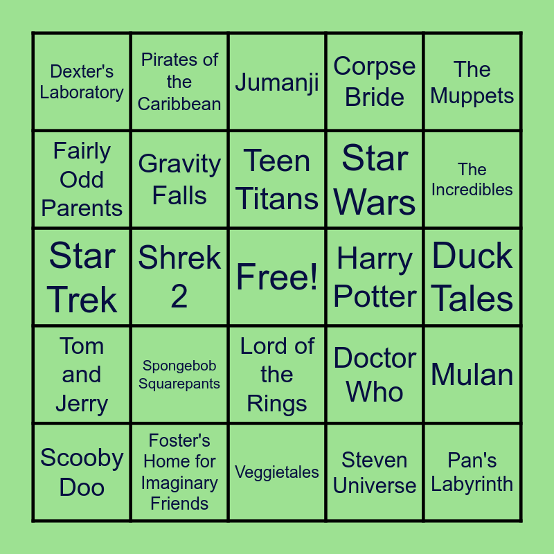 This bingo card has a free space and 24 words: Spongebob Squarepants, Foster's Home for Imaginary Friends, Teen Titans, Scooby Doo, The Muppets, Dexter's Laboratory, Fairly Odd Parents, Pirates of the Caribbean, Harry Potter, Lord of the Rings, Star Wars, Star Trek, Doctor Who, Mulan, Gravity Falls, Steven Universe, Duck Tales, Jumanji, The Incredibles, Shrek 2, Pan's Labyrinth, Tom and Jerry, Corpse Bride and Veggietales.