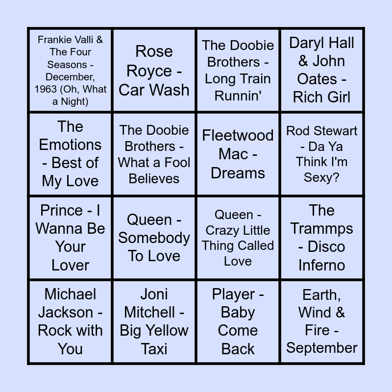 This bingo card has 62 words: Bee Gees - Stayin' Alive, Stevie Wonder - Signed, Sealed, Delivered (I'm Yours), Bob Marley & The Wailers - Three Little Birds, Earth, Wind & Fire - September, Eagles - Hotel California, TOTO - Hold the Line, Fleetwood Mac - Dreams, Curtis Mayfield - Move on Up, Prince - I Wanna Be Your Lover, King Harvest - Dancing In The Moonlight, Daryl Hall & John Oates - Rich Girl, Donna Summer - I Feel Love, The Doobie Brothers - What a Fool Believes, Chaka Khan - I'm Every Woman, Bee Gees - More Than A Woman, Frankie Valli & The Four Seasons - December, 1963 (Oh, What a Night), Michael Jackson - Rock with You, The Emotions - Best of My Love, Elton John - Tiny Dancer, Rod Stewart - Da Ya Think I'm Sexy?, Joni Mitchell - Big Yellow Taxi, The Doobie Brothers - Long Train Runnin', CHIC - Good Times, ABBA - Gimme! Gimme! Gimme! (A Man After Midnight), Hot Chocolate - You Sexy Thing, Rupert Holmes - Escape (The Pina Colada Song), CHIC - I Want Your Love, Todd Rundgren - I Saw the Light, Elton John - Crocodile Rock, Michael Jackson - Don't Stop 'Til You Get Enough, Frankie Valli - Grease, David Bowie - Heroes, ABBA - Dancing Queen, The Buggles - Video Killed The Radio Star, Player - Baby Come Back, Rose Royce - Car Wash, The Jacksons - Blame It on the Boogie, The Jackson 5 - I Want You Back, The Trammps - Disco Inferno, Queen - Don't Stop Me Now, Queen - Crazy Little Thing Called Love, Dire Straits - Sultans Of Swing, Leo Sayer - You Make Me Feel Like Dancing, Stevie Wonder - Superstition, Queen - Somebody To Love, The Police - Roxanne, Hues Corporation - Rock the Boat, Thin Lizzy - The Boys Are Back In Town, Van Morrison - Moondance, The Knack - My Sharona, Bruce Springsteen - Born to Run, Kate Bush - Wuthering Heights, Sister Sledge - We Are Family, Baccara - Yes Sir, I Can Boogie, Aerosmith - Walk This Way, John Travolta - You're The One That I Want, Earth, Wind & Fire - Boogie Wonderland, Gloria Gaynor - I Will Survive, John Paul Young - Love Is In The Air, LaBelle - Lady Marmalade, Lynyrd Skynyrd - Sweet Home Alabama and Village People - YMCA.