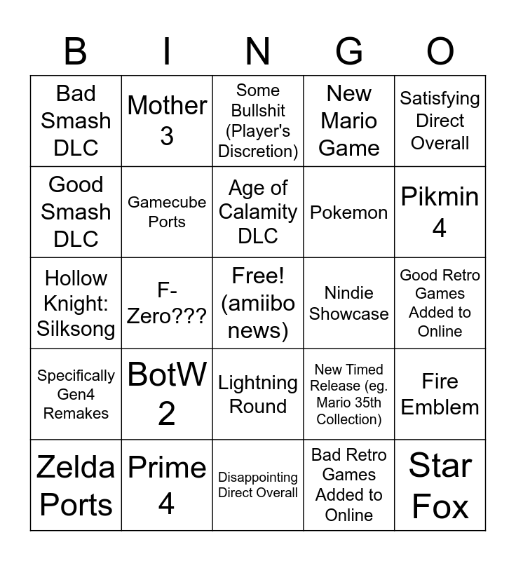 This bingo card has a free space and 24 words: BotW 2, Prime 4, Age of Calamity DLC, Zelda Ports, Satisfying Direct Overall, Bad Smash DLC, Good Smash DLC, Mother 3, Nindie Showcase, Lightning Round, Pokemon, Hollow Knight: Silksong, New Timed Release (eg. Mario 35th Collection), Fire Emblem, Gamecube Ports, Bad Retro Games Added to Online, Good Retro Games Added to Online, Some Bullshit (Player's Discretion), Pikmin 4, F-Zero???, Star Fox, Specifically Gen4 Remakes, New Mario Game and Disappointing Direct Overall.