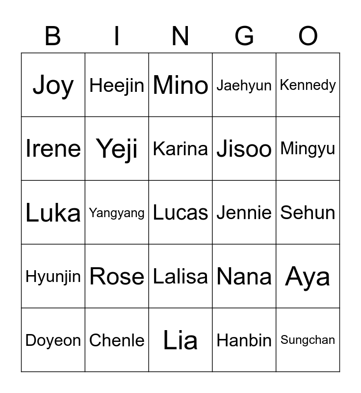This bingo card has 25 words: Rose, Lia, Karina, Doyeon, Kennedy, Joy, Irene, Heejin, Jennie, Lalisa, Jisoo, Luka, Nana, Aya, Yeji, Sungchan, Sehun, Mino, Mingyu, Yangyang, Lucas, Chenle, Hyunjin, Jaehyun and Hanbin.