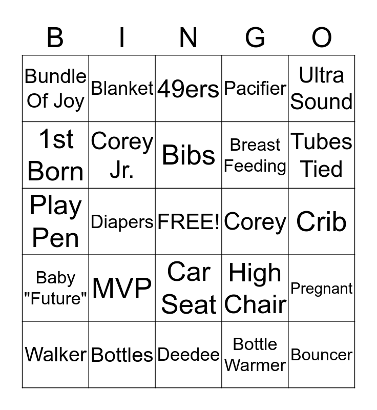 This bingo card has a free space and 24 words: MVP, Bottles, Bibs, Walker, Ultra Sound, Bundle Of Joy, 1st Born, Blanket, Corey, Car Seat, Breast Feeding, Play Pen, High Chair, Pregnant, Corey Jr., Bottle Warmer, Crib, 49ers, Tubes Tied, Diapers, Bouncer, Baby "Future", Pacifier and Deedee.