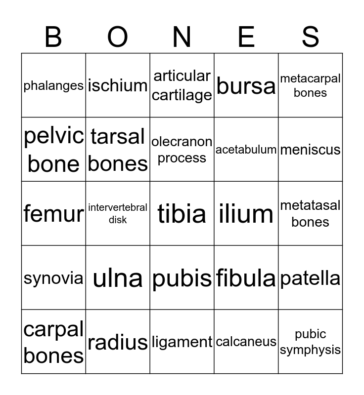 This bingo card has a free space and 24 words: ulna, radius, olecranon process, carpal bones, metacarpal bones, phalanges, pelvic bone, ischium, ilium, pubis, acetabulum, femur, fibula, patella, tarsal bones, calcaneus, metatasal bones, articular cartilage, meniscus, intervertebral disk, pubic symphysis, synovia, bursa and ligament.