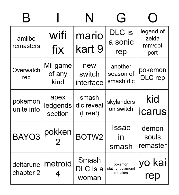 This bingo card has a free space and 24 words: pokken 2, metroid 4, new switch interface, deltarune chapter 2, legend of zelda mm/oot port, amiibo remasters, Overwatch rep, wifi fix, skylanders on switch, BOTW2, another season of smash dlc, pokemon unite info, Issac in smash, demon souls remaster, Mii game of any kind, pokemon platinum/diamond remakes, kid icarus, mario kart 9, pokemon DLC rep, apex ledgends section, yo kai rep, BAYO3, DLC is a sonic rep and Smash DLC is a woman.