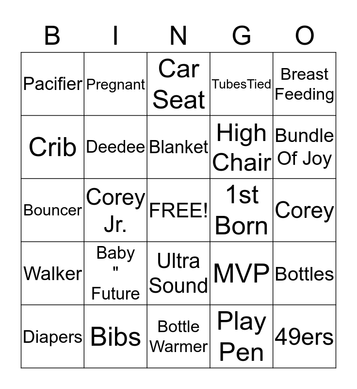 This bingo card has a free space and 24 words: Baby " Future, Bibs, Blanket, Diapers, Breast Feeding, Pacifier, Crib, Pregnant, 1st Born, Ultra Sound, High Chair, Bouncer, MVP, Bottles, Deedee, Play Pen, Corey, Car Seat, Bundle Of Joy, Corey Jr., 49ers, Walker, TubesTied and Bottle Warmer.