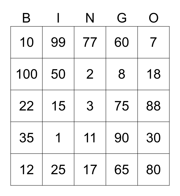 This bingo card has 25 words: 1, 17, 2, 12, 7, 10, 100, 99, 75, 11, 8, 22, 90, 30, 50, 80, 88, 77, 18, 15, 3, 25, 35, 60 and 65.