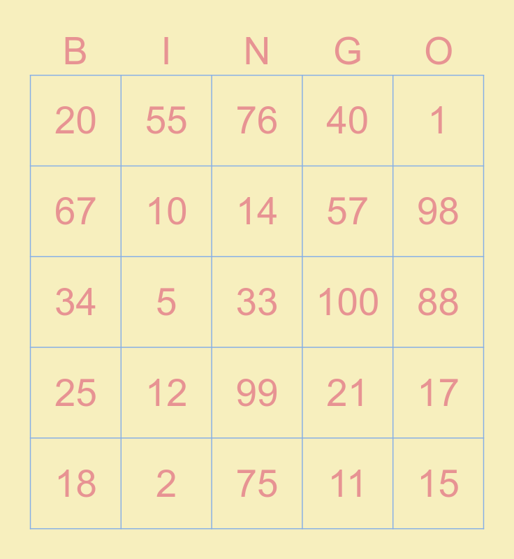 This bingo card has a free space and 24 words: 12, 2, 14, 18, 1, 20, 67, 55, 100, 99, 57, 34, 21, 17, 10, 11, 88, 76, 98, 5, 15, 25, 40 and 75.
