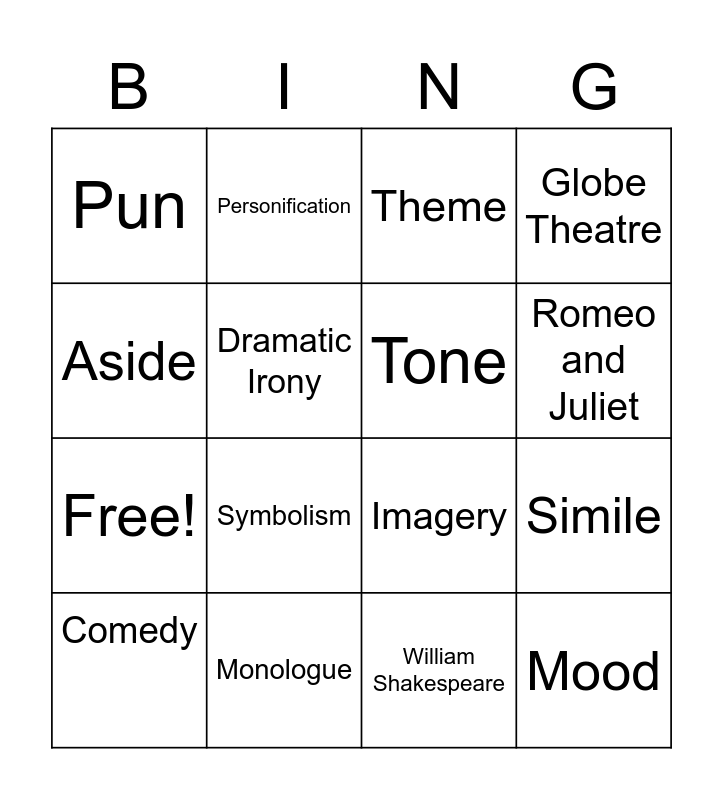 This bingo card has 20 words: Simile, Metaphor, Theme, Tragedy, Comedy, Aside, Monologue, Pun, Free!, Personification, Symbolism, Imagery, Dramatic Irony, Mood, Tone, England, Romeo and Juliet, Globe Theatre, William Shakespeare and Sonnet.