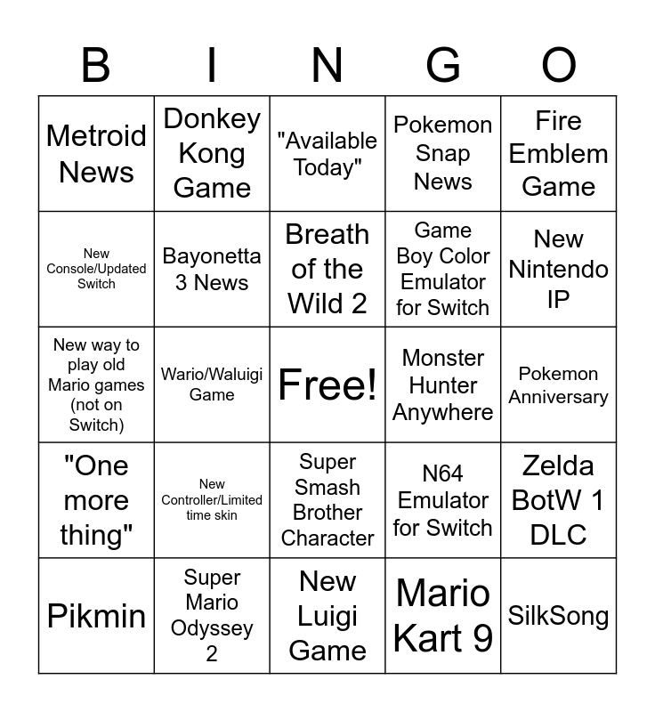 This bingo card has a free space and 26 words: Super Smash Brother Character, Mario Kart 9, Breath of the Wild 2, Super Mario Odyssey 2, Fire Emblem Game, Metroid News, New Console/Updated Switch, Donkey Kong Game, Pokemon Anniversary, N64 Emulator for Switch, Game Boy Color Emulator for Switch, New way to play old Mario games (not on Switch), Zelda BotW 1 DLC, Pikmin, Wario/Waluigi Game, Animal Crossing Update, Pokemon Snap News, "One more thing", "Available Today", SilkSong, New Nintendo IP, New Luigi Game, Monster Hunter Anywhere, New Controller/Limited time skin, Bayonetta 3 News and Switch Sports.
