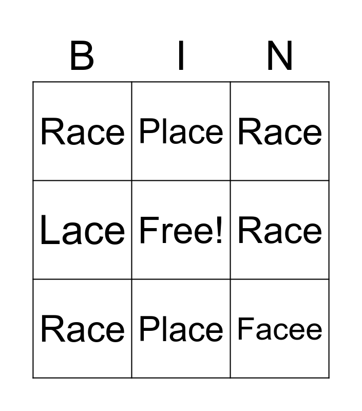 This bingo card has a free space and 28 words: Place, Lace, Face, Place, Race, Race, Place, Lace, Place, Place, Face, Lace, Lace, Face, Place, Lace, Place, Race, Place, Face, Race, Face, Lace, Race, Lace, Place, Facee and Race.