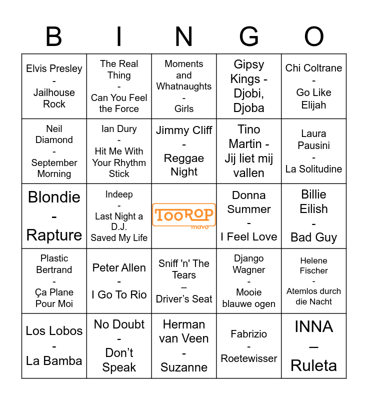 This bingo card has a free space and 27 words: Django Wagner - Mooie blauwe ogen, Klein Orkest - Ellie, Tino Martin - Jij liet mij vallen, Herman van Veen - Suzanne, Neil Diamond - September Morning, Moments and Whatnaughts - Girls, The Real Thing - Can You Feel the Force, Plastic Bertrand - Ça Plane Pour Moi, Donna Summer - I Feel Love, Helene Fischer - Atemlos durch die Nacht, Blondie - Rapture, Gipsy Kings - Djobi, Djoba, Los Lobos - La Bamba, No Doubt - Don’t Speak, Laura Pausini - La Solitudine, Kings of Leon - Use Somebody, Ian Dury - Hit Me With Your Rhythm Stick, Jimmy Cliff - Reggae Night, Peter Allen - I Go To Rio, Elvis Presley - Jailhouse Rock, Billie Eilish - Bad Guy, Fabrizio - Roetewisser, Indeep - Last Night a D.J. Saved My Life, INNA – Ruleta, Sniff 'n' The Tears – Driver’s Seat, Chi Coltrane - Go Like Elijah and Run–D.M.C. - Walk This Way.