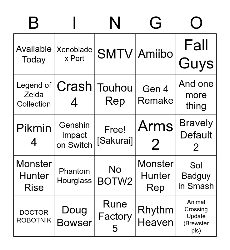 This bingo card has a free space and 24 words: Phantom Hourglass, Doug Bowser, Touhou Rep, DOCTOR ROBOTNIK, Fall Guys, Available Today, Legend of Zelda Collection, Xenoblade x Port, Arms 2, No BOTW2, Gen 4 Remake, Pikmin 4, Monster Hunter Rep, Sol Badguy in Smash, Crash 4, Rhythm Heaven, Bravely Default 2, SMTV, And one more thing, Genshin Impact on Switch, Animal Crossing Update (Brewster pls), Monster Hunter Rise, Amiibo and Rune Factory 5.