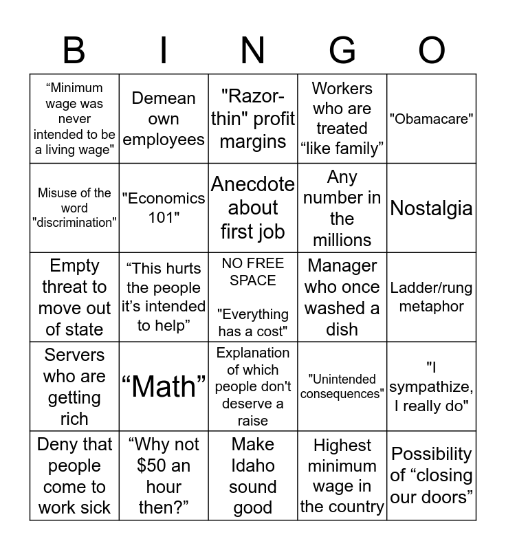This bingo card has a free space and 24 words: “Math”, “Why not $50 an hour then?”, Anecdote about first job, Deny that people come to work sick, "Obamacare", “Minimum wage was never intended to be a living wage", Misuse of the word "discrimination", Demean own employees, Manager who once washed a dish, Explanation of which people don't deserve a raise, Any number in the millions, Empty threat to move out of state, "Unintended consequences", "I sympathize, I really do", "Economics 101", Highest minimum wage in the country, Ladder/rung metaphor, "Razor-thin" profit margins, Nostalgia, “This hurts the people it’s intended to help”, Possibility of “closing our doors”, Servers who are getting rich, Workers who are treated “like family” and Make Idaho sound good.