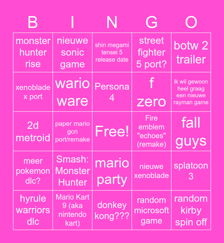 This bingo card has a free space and 24 words: Smash: Monster Hunter, Mario Kart 9 (aka nintendo kart), Persona 4, hyrule warriors dlc, botw 2 trailer, monster hunter rise, xenoblade x port, nieuwe sonic game, Fire emblem "echoes" (remake), mario party, f zero, 2d metroid, nieuwe xenoblade, splatoon 3, wario ware, random microsoft game, fall guys, shin megami tensei 5 release date, ik wil gewoon heel graag een nieuwe rayman game, paper mario gcn port/remake, random kirby spin off, meer pokemon dlc?, street fighter 5 port? and donkey kong???.