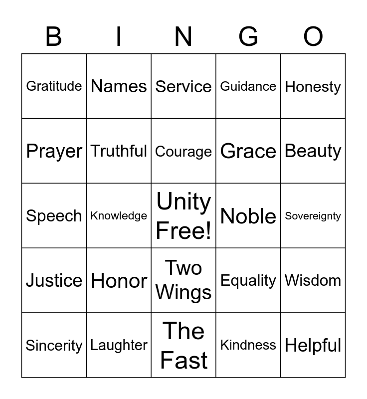 This bingo card has a free space and 59 words: Joyous, Laughter, Consultation, Justice, Kindness, Radiance, Truthful, Trustworthy, Grace, Compassion, Guidance, Humility, Prayer, Detachment, Faith, Gratitude, Helpful, Honesty, Hopeful, Courage, Noble, Service, Sincerity, Wisdom, Wonderment, Mirror, Splendor, Light, Beauty, Glory, Grandeur, Mercy, Words, Perfection, Names, Might, Will, Knowledge, Power, Speech, Questions, Honor, Sovereignty, Dominion, Loftiness, Peaceful, Patience, Generosity, Two Wings, The Fast, Naw Ruz, The Feast, Flowers of One Garden, Leaves of One Tree, Waves of One Ocean, Equality, Posture of Learning, Ever-advancing Civilization and Community Building.