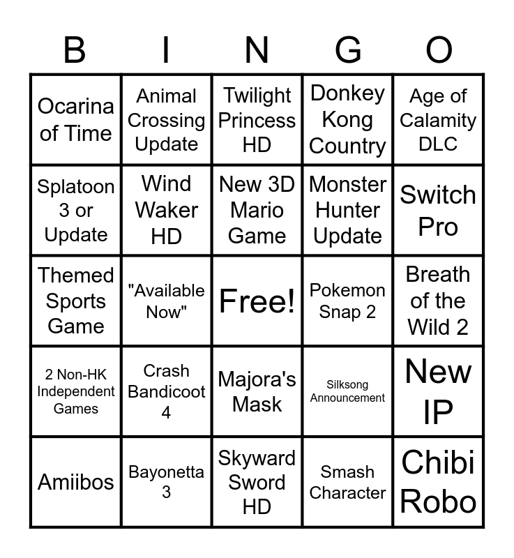 This bingo card has a free space and 30 words: Bayonetta 3, Metroid Prime 4, "Available Now", Bravely Default 2, Ocarina of Time, Twilight Princess HD, Wind Waker HD, Majora's Mask, Pokemon Snap 2, Skyward Sword HD, Breath of the Wild 2, Chibi Robo, Smash Character, Pikmin Reveal, Switch Pro, Gen 4 Remakes, Silksong Announcement, 2 Non-HK Independent Games, Crash Bandicoot 4, Age of Calamity DLC, Themed Sports Game, Kid Icarus or Star Fox, Animal Crossing Update, Monster Hunter Update, Splatoon 3 or Update, Donkey Kong Country, New IP, Amiibos, New 3D Mario Game and Fake Out Ending.