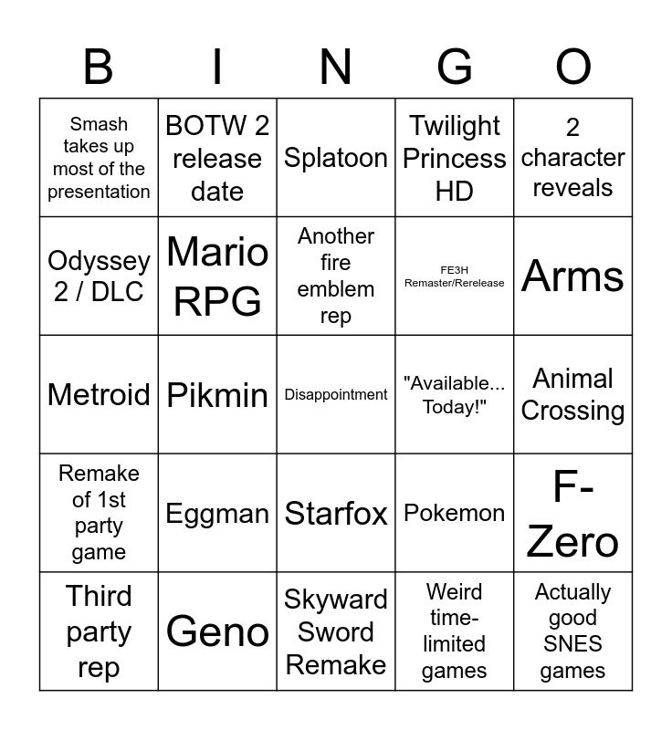 This bingo card has a free space and 24 words: Eggman, Geno, Another fire emblem rep, Third party rep, 2 character reveals, Smash takes up most of the presentation, Odyssey 2 / DLC, BOTW 2 release date, "Available... Today!", Starfox, FE3H Remaster/Rerelease, Metroid, Pokemon, F-Zero, Mario RPG, Weird time-limited games, Animal Crossing, Splatoon, Arms, Pikmin, Actually good SNES games, Remake of 1st party game, Twilight Princess HD and Skyward Sword Remake.