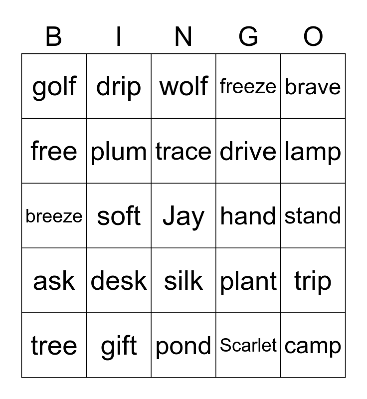 This bingo card has 30 words: gift, lift, soft, elf, golf, wolf, plum, silk, hand, pond, stand, Jay, Scarlet, camp, lamp, drink, plant, ask, desk, brave, breeze, bride, drip, drive, free, freeze, trip, tree, trace and clam.