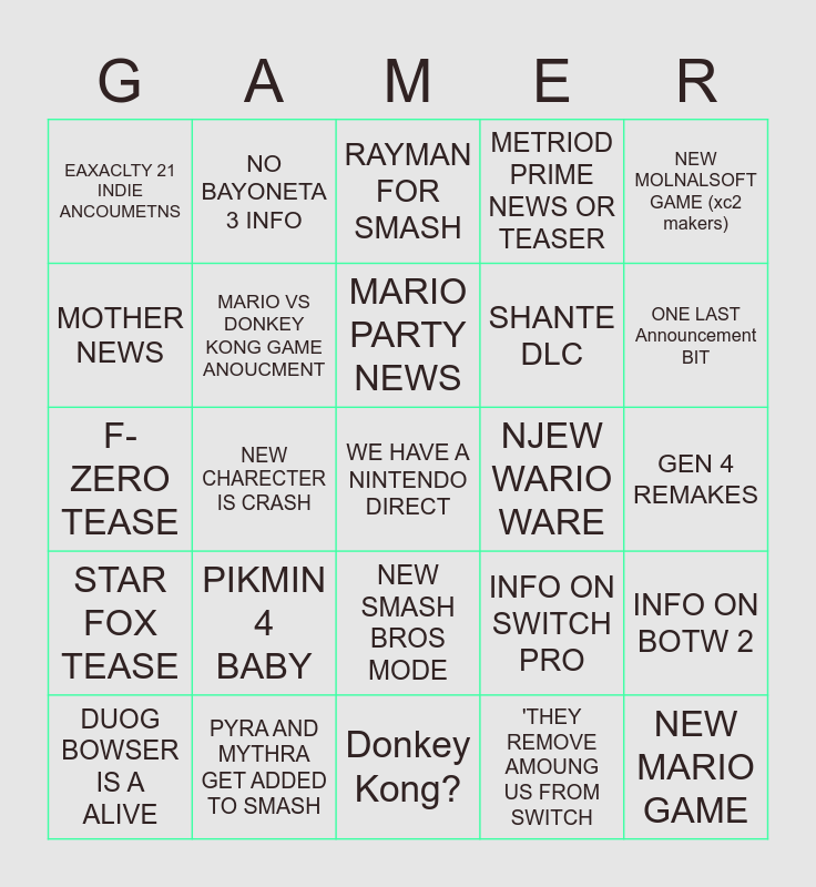 This bingo card has a free space and 24 words: PIKMIN 4 BABY, PYRA AND MYTHRA GET ADDED TO SMASH, MARIO PARTY NEWS, DUOG BOWSER IS A ALIVE, NEW MOLNALSOFT GAME (xc2 makers), EAXACLTY 21 INDIE ANCOUMETNS, MOTHER NEWS, NO BAYONETA 3 INFO, NJEW WARIO WARE, NEW SMASH BROS MODE, SHANTE DLC, F-ZERO TEASE, INFO ON SWITCH PRO, INFO ON BOTW 2, MARIO VS DONKEY KONG GAME ANOUCMENT, 'THEY REMOVE AMOUNG US FROM SWITCH, GEN 4 REMAKES, RAYMAN FOR SMASH, ONE LAST Announcement BIT, NEW CHARECTER IS CRASH, NEW MARIO GAME, STAR FOX TEASE, METRIOD PRIME NEWS OR TEASER and Donkey Kong?.