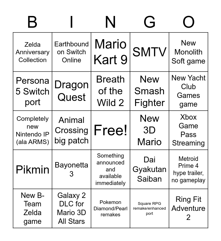 This bingo card has a free space and 24 words: Bayonetta 3, Galaxy 2 DLC for Mario 3D All Stars, Breath of the Wild 2, New B-Team Zelda game, New Monolith Soft game, Zelda Anniversary Collection, Persona 5 Switch port, Earthbound on Switch Online, New 3D Mario, Something announced and available immediately, New Smash Fighter, Completely new Nintendo IP (ala ARMS), Dai Gyakutan Saiban, Metroid Prime 4 hype trailer, no gameplay, Dragon Quest, Square RPG remake/enhanced port, Xbox Game Pass Streaming, Mario Kart 9, New Yacht Club Games game, Animal Crossing big patch, Ring Fit Adventure 2, Pikmin, SMTV and Pokemon Diamond/Pearl remakes.