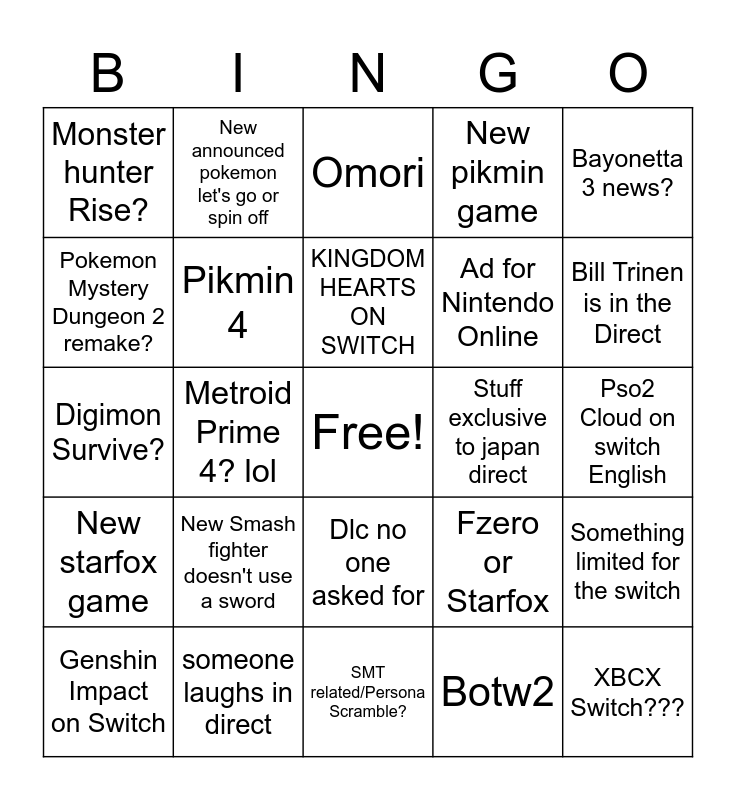This bingo card has a free space and 24 words: New Smash fighter doesn't use a sword, someone laughs in direct, KINGDOM HEARTS ON SWITCH, Genshin Impact on Switch, Bayonetta 3 news?, Monster hunter Rise?, Pokemon Mystery Dungeon 2 remake?, New announced pokemon let's go or spin off, Stuff exclusive to japan direct, Dlc no one asked for, Ad for Nintendo Online, Digimon Survive?, Fzero or Starfox, Something limited for the switch, Pikmin 4, Botw2, Pso2 Cloud on switch English, Omori, Bill Trinen is in the Direct, Metroid Prime 4? lol, XBCX Switch???, New starfox game, New pikmin game and SMT related/Persona Scramble?.