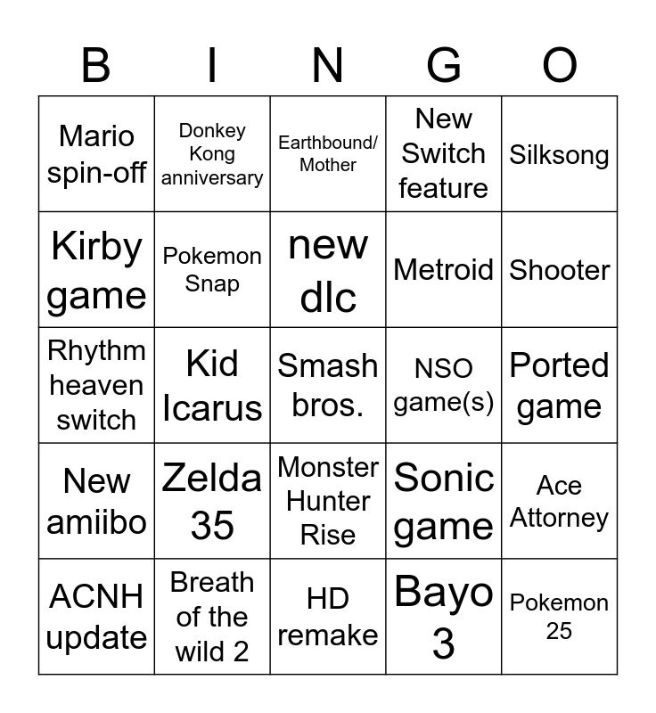 This bingo card has a free space and 24 words: Zelda 35, Breath of the wild 2, new dlc, ACNH update, Silksong, Mario spin-off, Kirby game, Donkey Kong anniversary, NSO game(s), Monster Hunter Rise, Metroid, Rhythm heaven switch, Sonic game, Ace Attorney, Pokemon Snap, Bayo 3, Ported game, Earthbound/ Mother, Shooter, Kid Icarus, Pokemon 25, New amiibo, New Switch feature and HD remake.