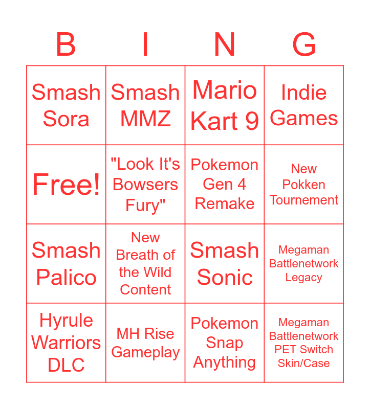 This bingo card has 16 words: MH Rise Gameplay, Megaman Battlenetwork Legacy, Mario Kart 9, Smash Sora, Smash Palico, Smash MMZ, Smash Sonic, Pokemon Snap Anything, Free!, "Look It's Bowsers Fury", Hyrule Warriors DLC, Indie Games, New Breath of the Wild Content, New Pokken Tournement, Pokemon Gen 4 Remake and Megaman Battlenetwork PET Switch Skin/Case.