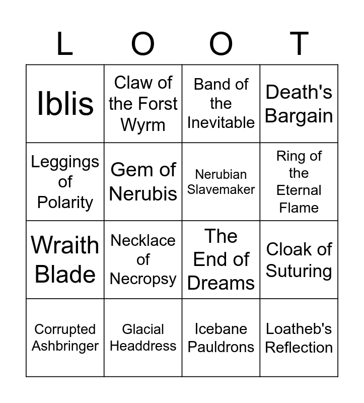 This bingo card has 16 words: Glacial Headdress, Cloak of Suturing, Band of the Inevitable, Iblis, Wraith Blade, Claw of the Forst Wyrm, The End of Dreams, Icebane Pauldrons, Leggings of Polarity, Gem of Nerubis, Corrupted Ashbringer, Death's Bargain, Necklace of Necropsy, Ring of the Eternal Flame, Nerubian Slavemaker and Loatheb's Reflection.