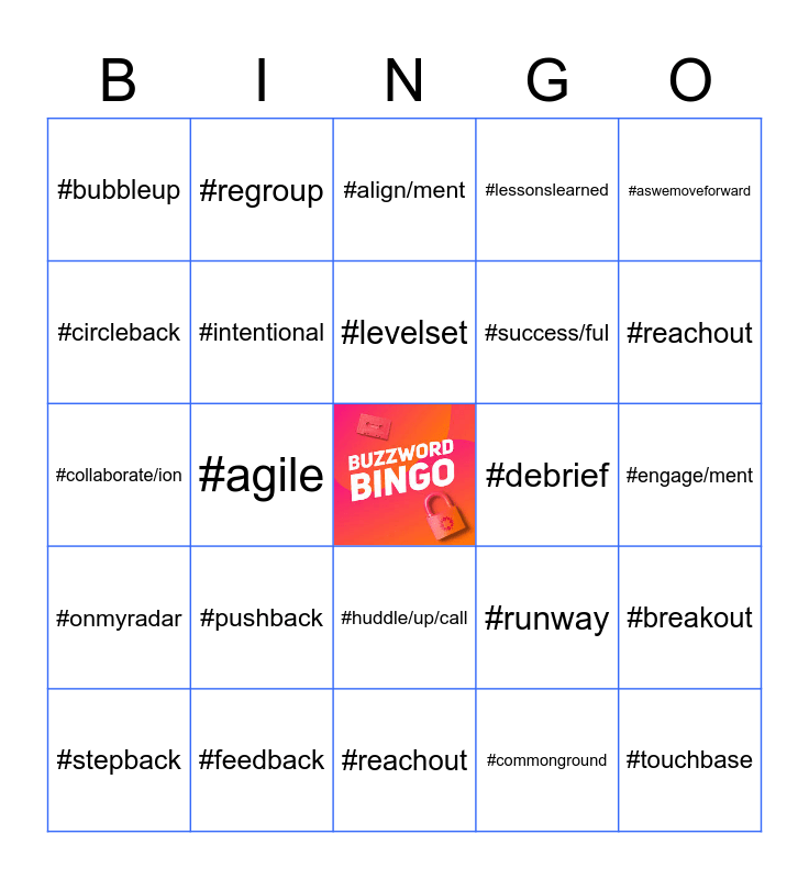 This bingo card has a free space and 24 words: #pushback, #feedback, #levelset, #stepback, #aswemoveforward, #bubbleup, #circleback, #regroup, #debrief, #huddle/up/call, #success/ful, #collaborate/ion, #runway, #breakout, #intentional, #commonground, #engage/ment, #align/ment, #reachout, #agile, #touchbase, #onmyradar, #lessonslearned and #reachout.