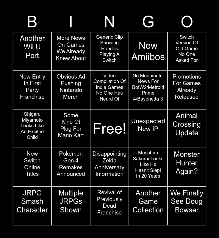 This bingo card has a free space and 24 words: Pokemon Gen 4 Remakes Announced, Multiple JRPGs Shown, Video Compilation Of Indie Games No One Has Heard Of, JRPG Smash Character, Switch Version Of Old Game No One Asked For, Another Wii U Port, New Entry In First Party Franchise, More News On Games We Already Knew About, Unexpected New IP, Disappointing Zelda Anniversary Information, No Meaningful News For BotW2/Metroid Prime 4/Bayonetta 3, Shigeru Miyamoto Looks Like An Excited Child, Masahiro Sakurai Looks Like He Hasn't Slept In 20 Years, Monster Hunter Again?, Obvious Ad Pushing Nintendo Merch, Another Game Collection, Animal Crossing Update, Generic Clip Showing Randos Playing A Switch, Promotions For Games Already Released, Some Kind Of Plug For Mario Kart, We Finally See Doug Bowser, New Switch Online Titles, New Amiibos and Revival of Previously Dead Franchise.