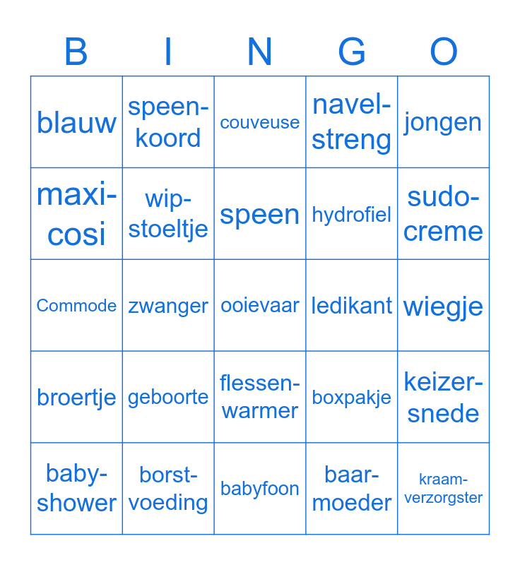 This bingo card has 40 words: Luier, Commode, kinder-wagen, wip-stoeltje, borst-voeding, flessen-warmer, speen, muisjes, jongen, broertje, zwanger, navel- streng, ooievaar, wiegje, ledikant, geboorte, prematuur, blauw, kaartje, couveuse, keizer-snede, baar-moeder, hydrofiel, maxi-cosi, aankleed-kussen, voedings-tas, kruiken, romper, kraam-verzorgster, darm-krampjes, consultatie-bureau, baby- shower, zwanger-schaps-verlof, boxpakje, sudo-creme, babyfoon, baby-shampoo, luier-emmer, speen- koord and vaderschaps-verlof.