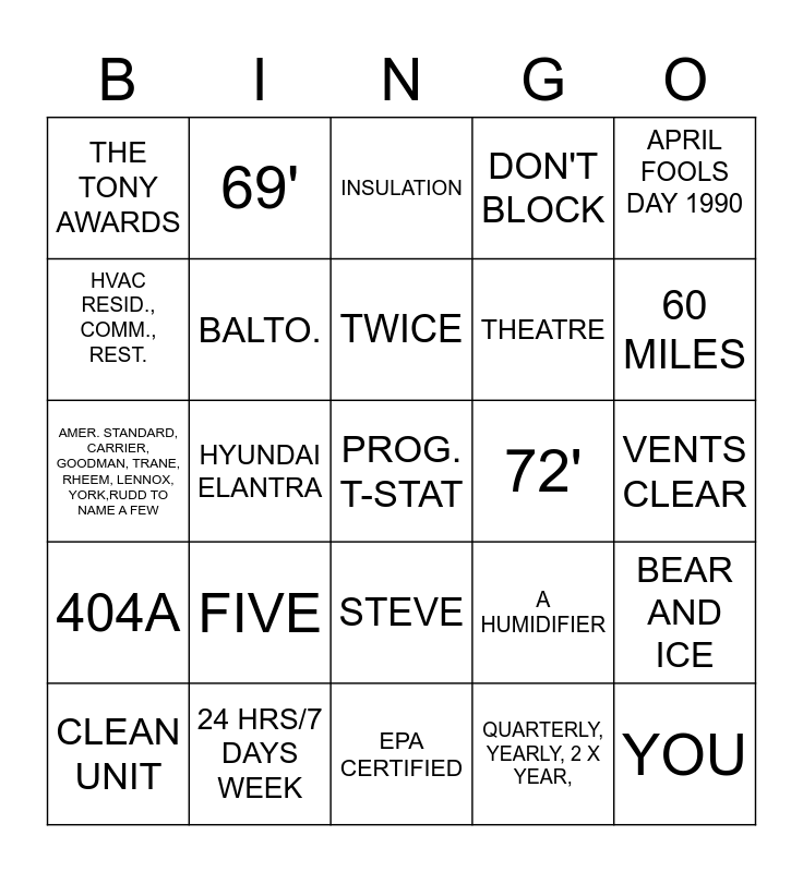 This bingo card has a free space and 24 words: FIVE, 24 HRS/7 DAYS WEEK, TWICE, CLEAN UNIT, APRIL FOOLS DAY 1990, THE TONY AWARDS, HVAC RESID., COMM., REST., 69', 72', STEVE, THEATRE, AMER. STANDARD, CARRIER, GOODMAN, TRANE, RHEEM, LENNOX, YORK,RUDD TO NAME A FEW, A HUMIDIFIER, BEAR AND ICE, BALTO., QUARTERLY, YEARLY, 2 X YEAR,, VENTS CLEAR, INSULATION, 60 MILES, HYUNDAI ELANTRA, YOU, 404A, DON'T BLOCK and EPA CERTIFIED.