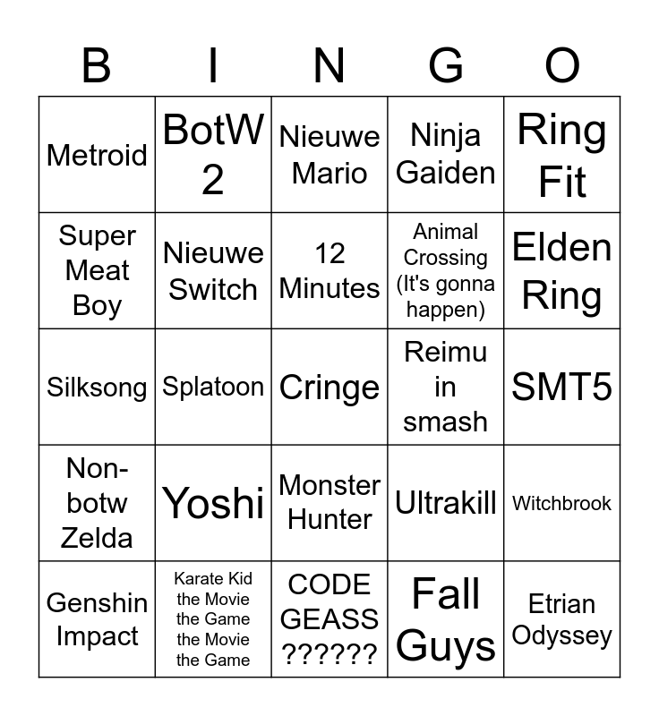 This bingo card has a free space and 24 words: Yoshi, Karate Kid the Movie the Game the Movie the Game, 12 Minutes, Genshin Impact, Ring Fit, Metroid, Super Meat Boy, BotW 2, Reimu in smash, Monster Hunter, Animal Crossing (It's gonna happen), Silksong, Ultrakill, Witchbrook, Nieuwe Switch, Fall Guys, SMT5, Nieuwe Mario, Elden Ring, Splatoon, Etrian Odyssey, Non-botw Zelda, Ninja Gaiden and CODE GEASS ??????.