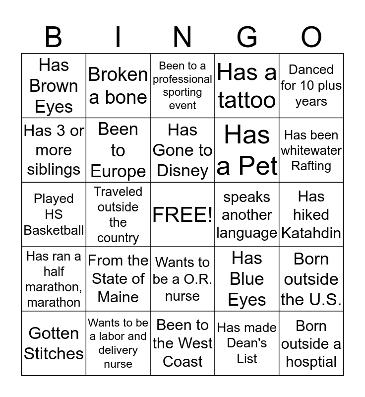 This bingo card has a free space and 24 words: From the State of Maine, Wants to be a labor and delivery nurse, Has Gone to Disney, Gotten Stitches, Danced for 10 plus years, Has Brown Eyes, Has 3 or more siblings, Broken a bone, speaks another language, Wants to be a O.R. nurse, Has a Pet, Played HS Basketball, Has Blue Eyes, Born outside the U.S., Been to Europe, Has made Dean's List, Has hiked Katahdin, Been to a professional sporting event, Has been whitewater Rafting, Traveled outside the country, Born outside a hosptial, Has ran a half marathon, marathon, Has a tattoo and Been to the West Coast.