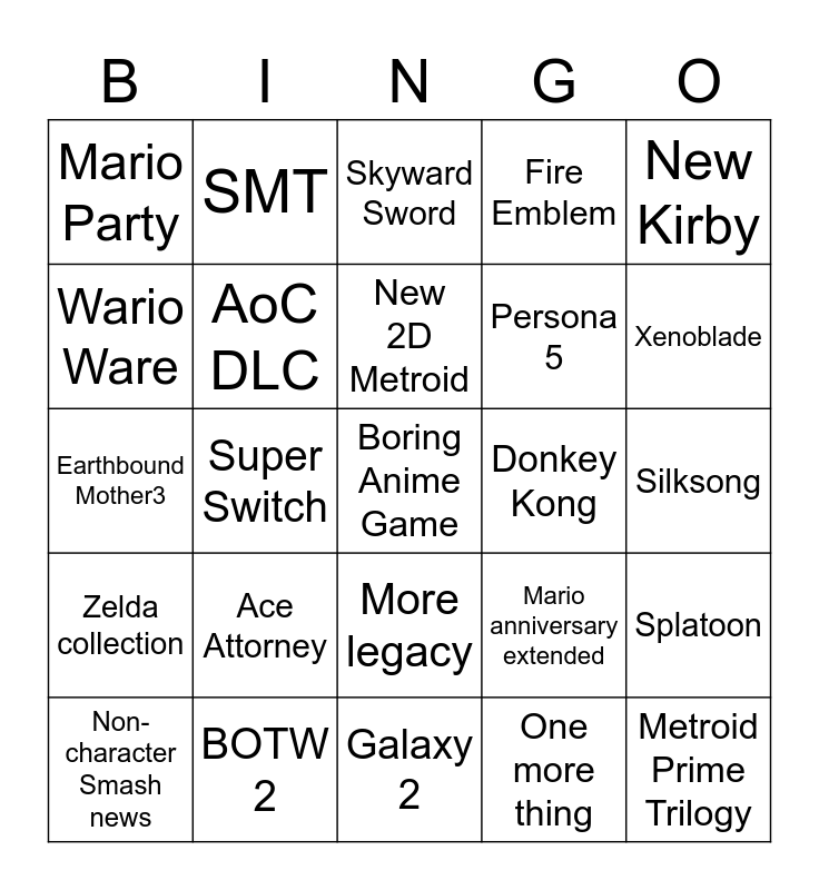 This bingo card has a free space and 24 words: Ace Attorney, BOTW 2, New 2D Metroid, Non-character Smash news, New Kirby, Mario Party, Wario Ware, SMT, Donkey Kong, More legacy, Persona 5, Earthbound Mother3, Mario anniversary extended, Splatoon, AoC DLC, One more thing, Silksong, Skyward Sword, Xenoblade, Super Switch, Metroid Prime Trilogy, Zelda collection, Fire Emblem and Galaxy 2.