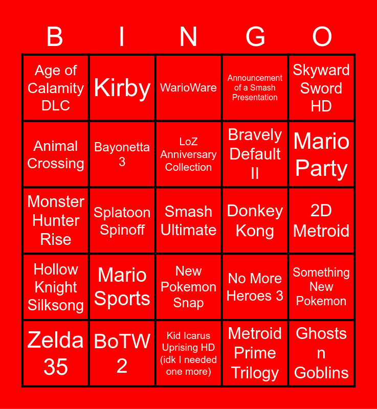 This bingo card has a free space and 24 words: Mario Sports, BoTW 2, LoZ Anniversary Collection, Zelda 35, Skyward Sword HD, Age of Calamity DLC, Animal Crossing, Kirby, Donkey Kong, New Pokemon Snap, Bravely Default II, Monster Hunter Rise, No More Heroes 3, Something New Pokemon, Bayonetta 3, Metroid Prime Trilogy, 2D Metroid, WarioWare, Mario Party, Splatoon Spinoff, Ghosts n Goblins, Hollow Knight Silksong, Announcement of a Smash Presentation and Kid Icarus Uprising HD (idk I needed one more).
