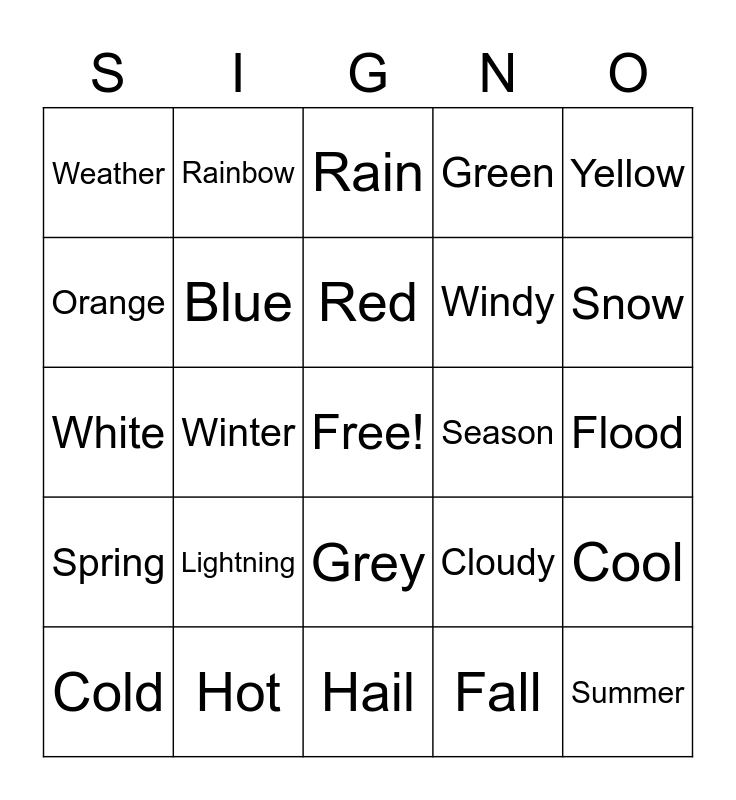 This bingo card has a free space and 35 words: Color, Black, Brown, Blue, Grey, Green, Orange, Pink, Red, Purple, White, Yellow, Inside, Outside, Weather, Season, Fall, Winter, Spring, Summer, Cloudy, Cold, Cool, Hot, Rain, Snow, Sunny, Warm, Windy, Flood, Frozen, Hail, Lightning, Rainbow and Thunder.